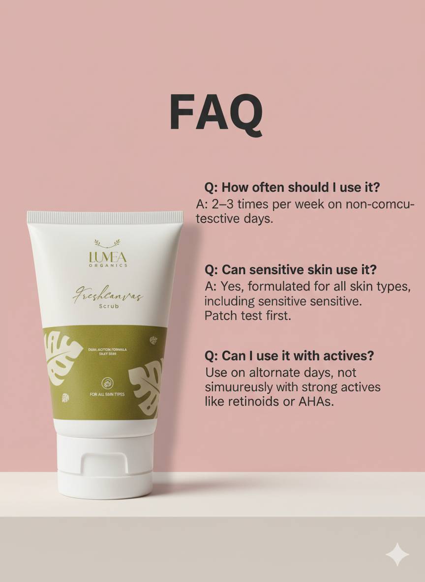 Use twice a week. Mix a small amount of the scrub with warm water or your favorite cleanser to create a paste. Gently massage onto damp skin in upward circular motions, avoiding the delicate eye area. Rinse thoroughly with warm water and pat dry.